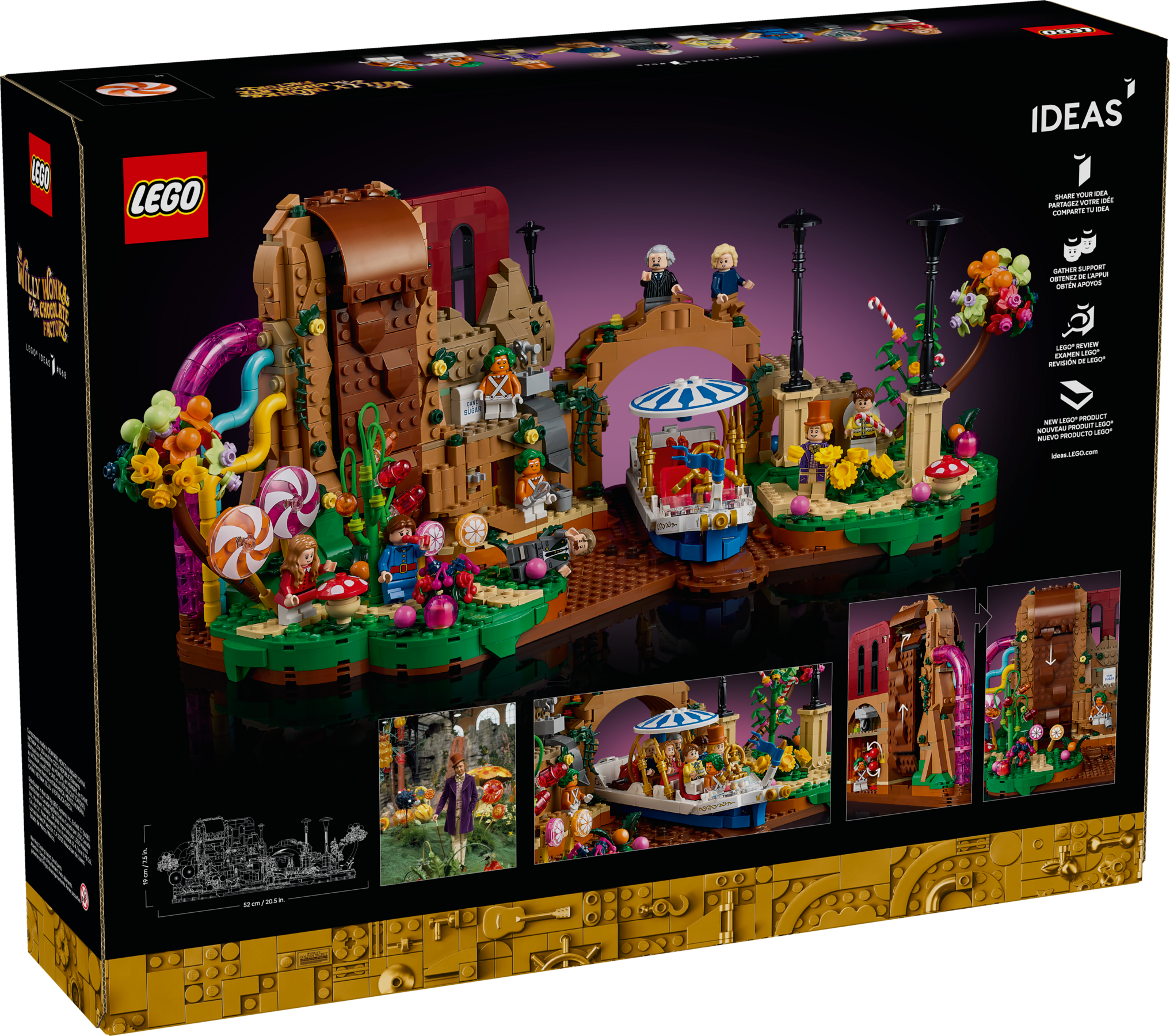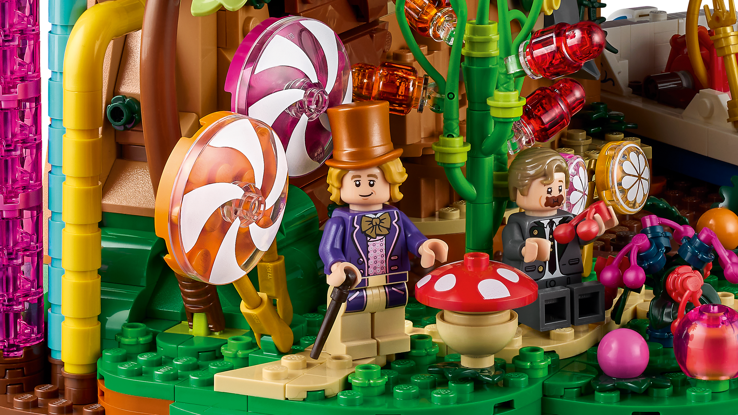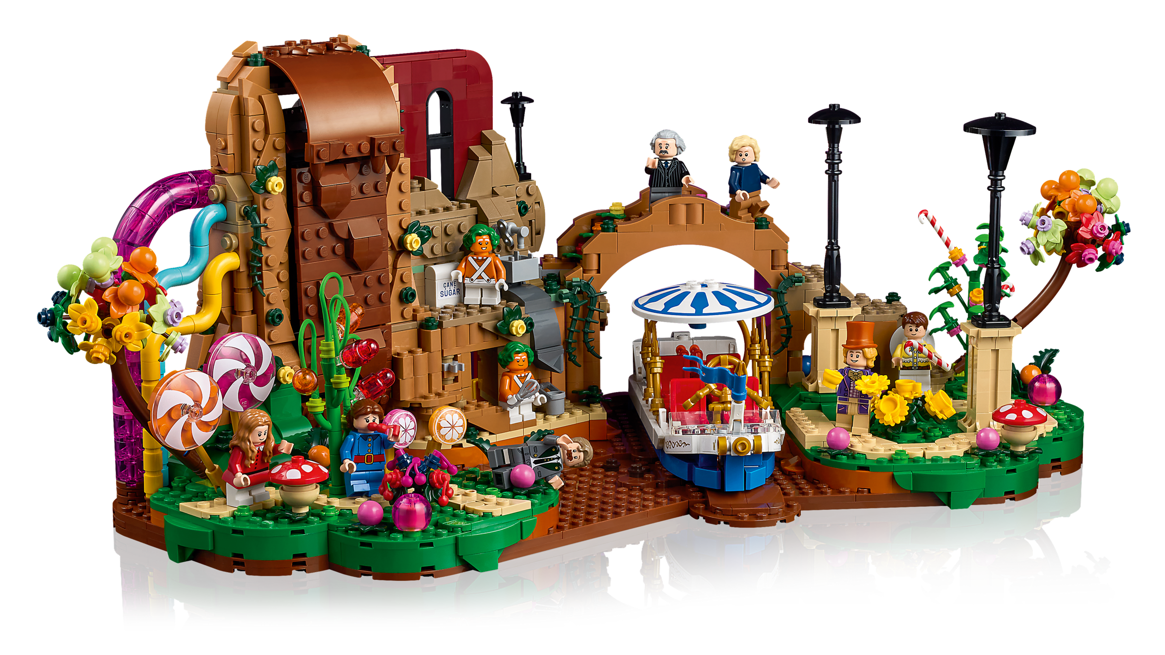 • Authentische Details aus LEGO® Steinen: Entdecke den Schokoladenwasserfall mit bunten Rohren, das Boot Wonkatania, den Arbeitsbereich der Umpa-Lumpas, Willy Wonkas Büro mit Geheimtür sowie fantasievolle Süßigkeitenpflanzen