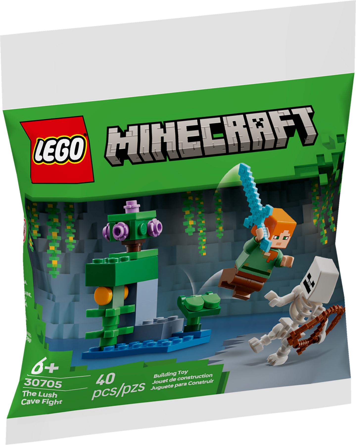 Alex benutzt ihr Diamantschwert, um ein Skelett mit einem Bogen aus einer üppigen Höhle zu verscheuchen, in der es Ton, Moos, Blumen, Ranken, Glühbeeren und Tropfblätter gibt.