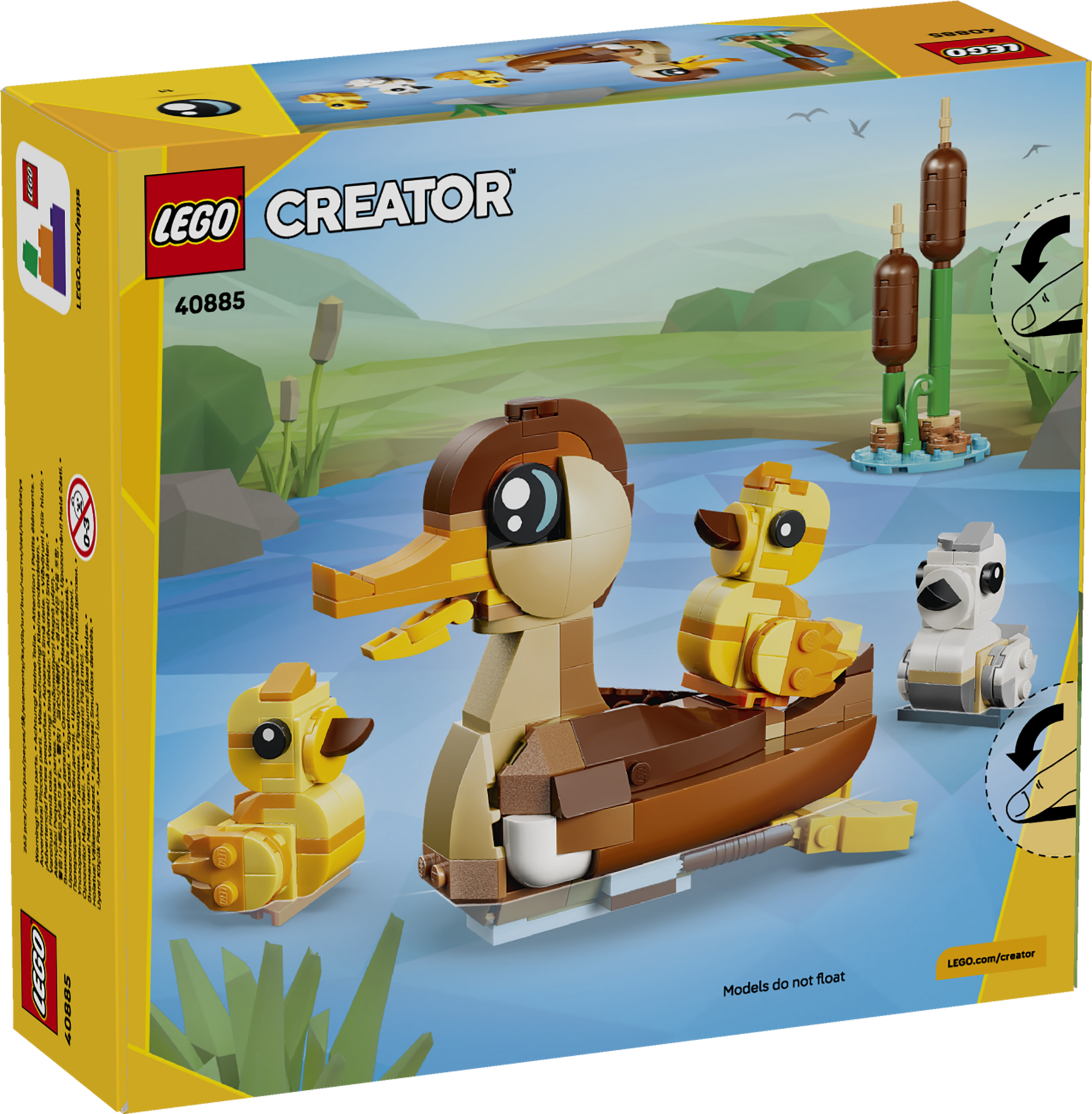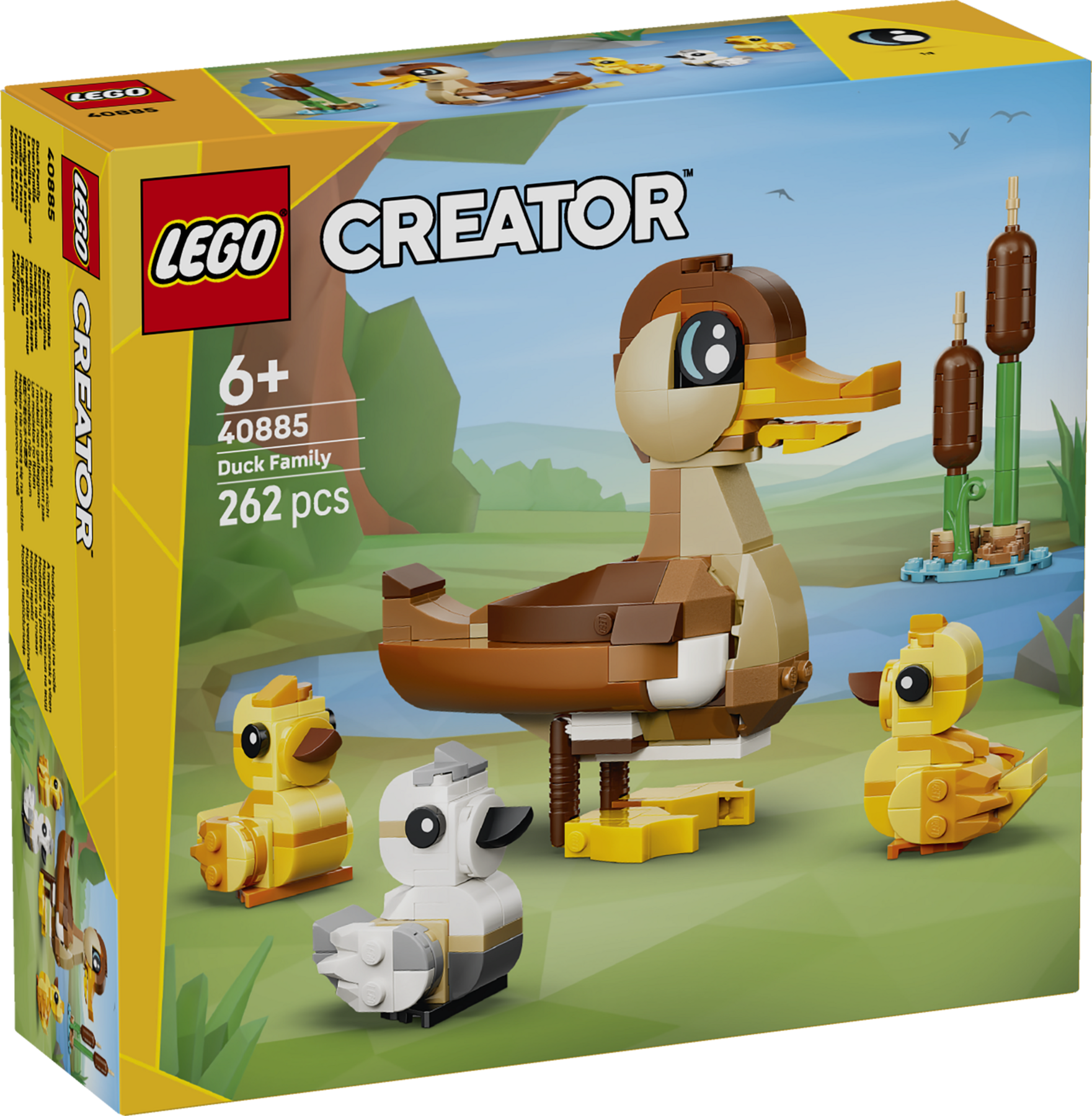 Dieses LEGO® Bauset (40885) lässt Mädchen und Jungen ab 6 Jahren viele tolle Geschichten mit den entzückenden Spielzeugenten darstellen. Das Spielset besteht aus einer Entenmama, 3 Entlein und Rohrkolben. Die Entenmama kann den Schnabel und die Beine bewegen, um sie stehend oder schwimmend zu positionieren. 1 Entlein kann auf ihrem Rücken sitzen. Nach dem Spielen wird die Entenfamilie zu einer süßen Zimmerdeko. Das Set besteht aus 262 Teilen.