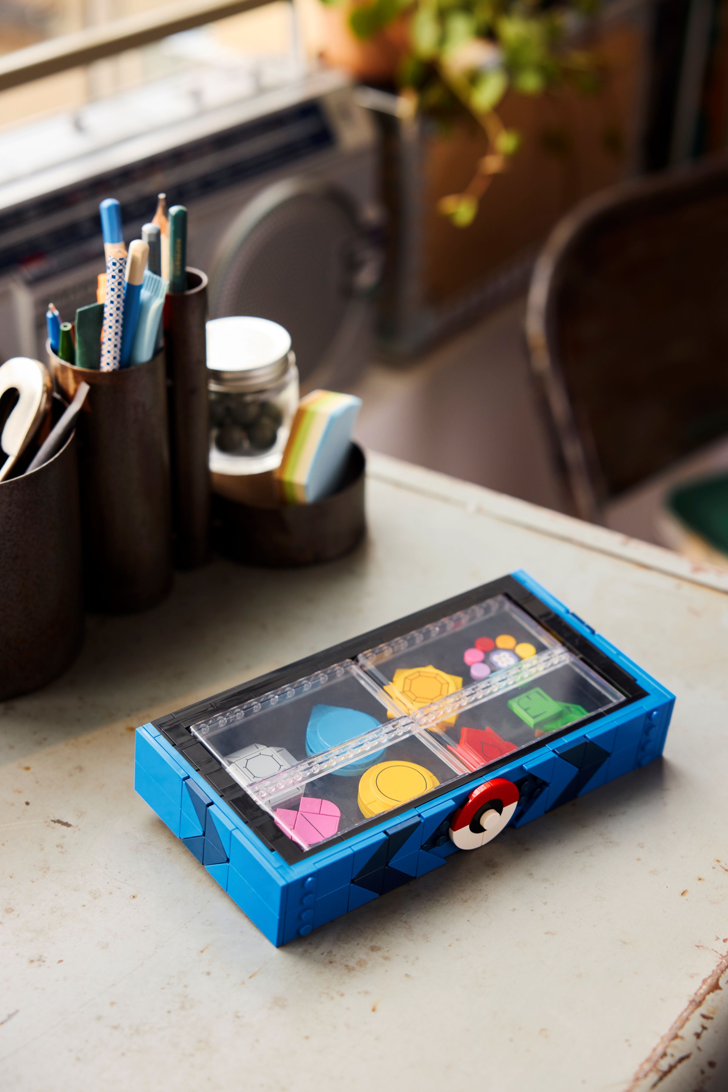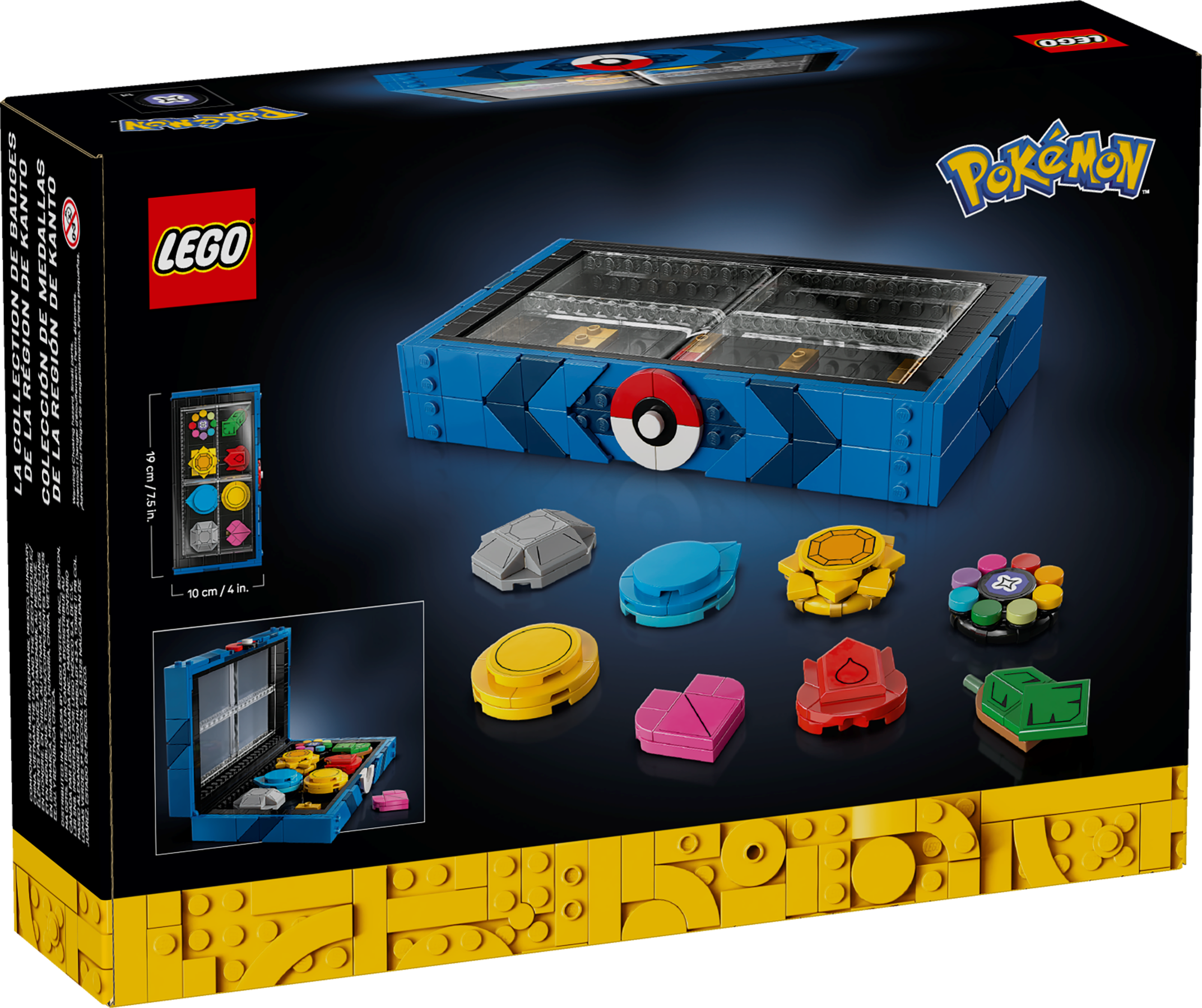 8 POKÉMON WETTKAMPFABZEICHEN: Diese aus Steinen gebaute Displaybox enthält die Orden der Kanto-Region Boulder, Cascade, Thunder, Rainbow, Soul, Marsh, Volcano und Earth, die mit einem von einem Pokéball inspirierten Verschluss gesichert sind