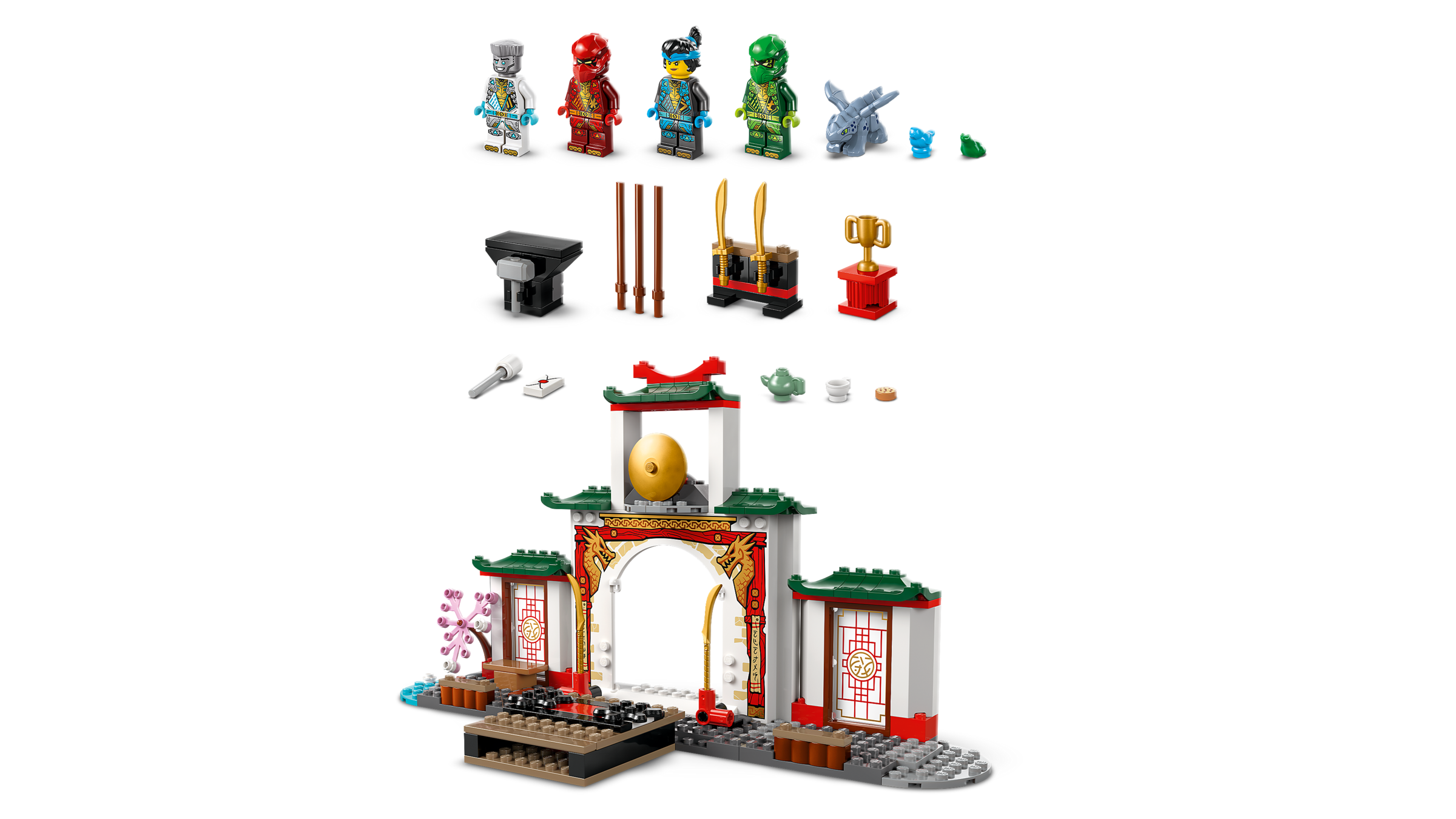 Dieses LEGO Set beinhaltet 4 NINJAGO Minifiguren: Zane, Nya, Kai und Lloyd sowie der Spielzeugdrache Baby Riyu laden zuvielen Actionrollenspielen ein. Für spannende Duelle kann man die Minifiguren auf 2 Drehteller stellen. Und auch die umfangreiche Ninja-Ausrüstung (unter anderem 2 Schwerter und 3 Stäbe) sowie ein Hammer, ein Vogel, ein Frosch, ein Siegerpokal, einKeks und ein Brief bieten unzählige Spielmöglichkeiten.