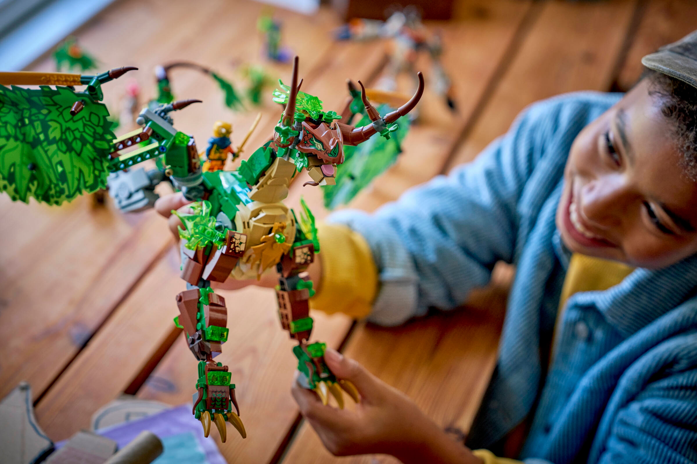 BEWEGLICHER DRACHE: Der grüne Drache kann seine Flügel ausbreiten oder anlegen und Kiefer, Kopf, Hals, Knöchel, Klauen und Schwanz bewegen. Außerdem trägt er einen Sattel für eine Minifigur