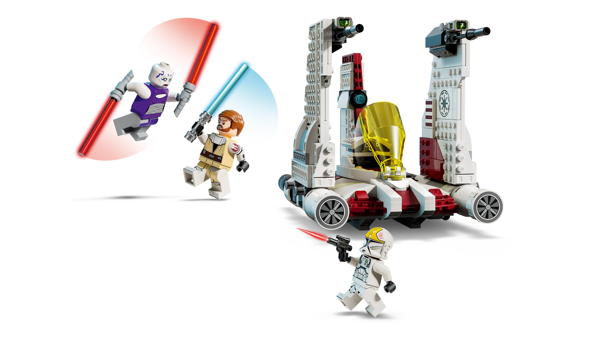 3 LEGO Star Wars Minifiguren: Asajj Ventress schwingt 2 rote Lichtschwerter mit gekrümmten Griffen, General Obi-Wan Kenobi hält ein blaues Lichtschwert und der Klon-Pilot hat eine Blaster-Pistole