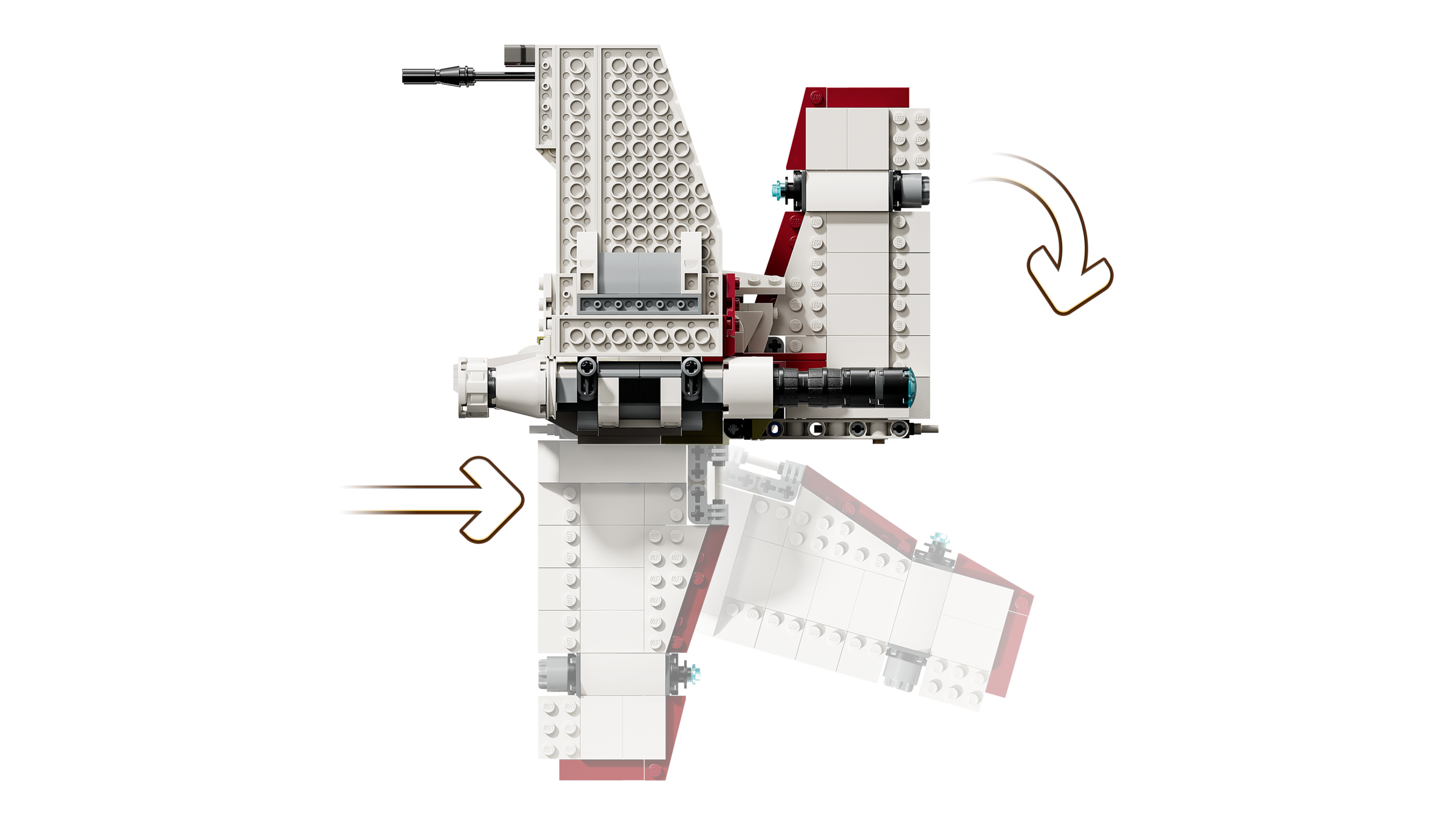 Star Wars Sternjäger aus LEGO Steinen: Das Modell hat ein aufklappbares Cockpit, 2 äußere Flügel, die man in den Flug- und Landemodus schwenken kann, und 2 Shooter für jede Menge Fantasy-Actionspaß