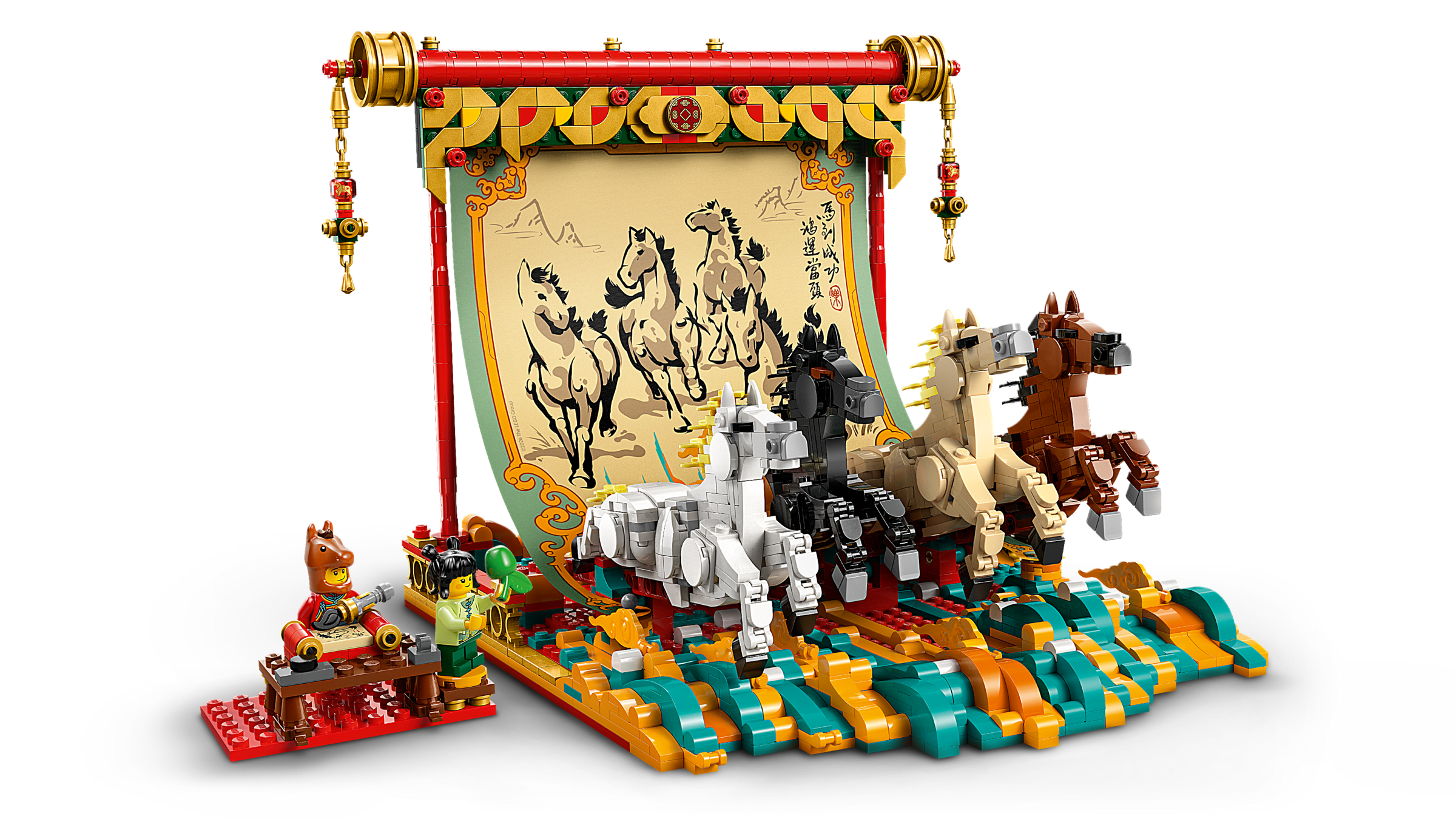 Häng die Leinwand mit einer Tuschezeichnung von 4 galoppierenden Pferden auf, die die traditionelle chinesische Segensformel „Erfolg bei Ankunft“ symbolisieren und das neue Jahr einläuten. Sie dient deinem Modell als Hintergrund. Bring die Beine der 4 Spielzeugpferde aus LEGO Steinen in Pose und dreh den Griff, um sie aus dem Gemälde „herausgaloppieren“ zu lassen. Pferde symbolisieren Stärke. Insgesamt 8 Pferde sind in Gemälde und Modell dargestellt und stehen für Glück.